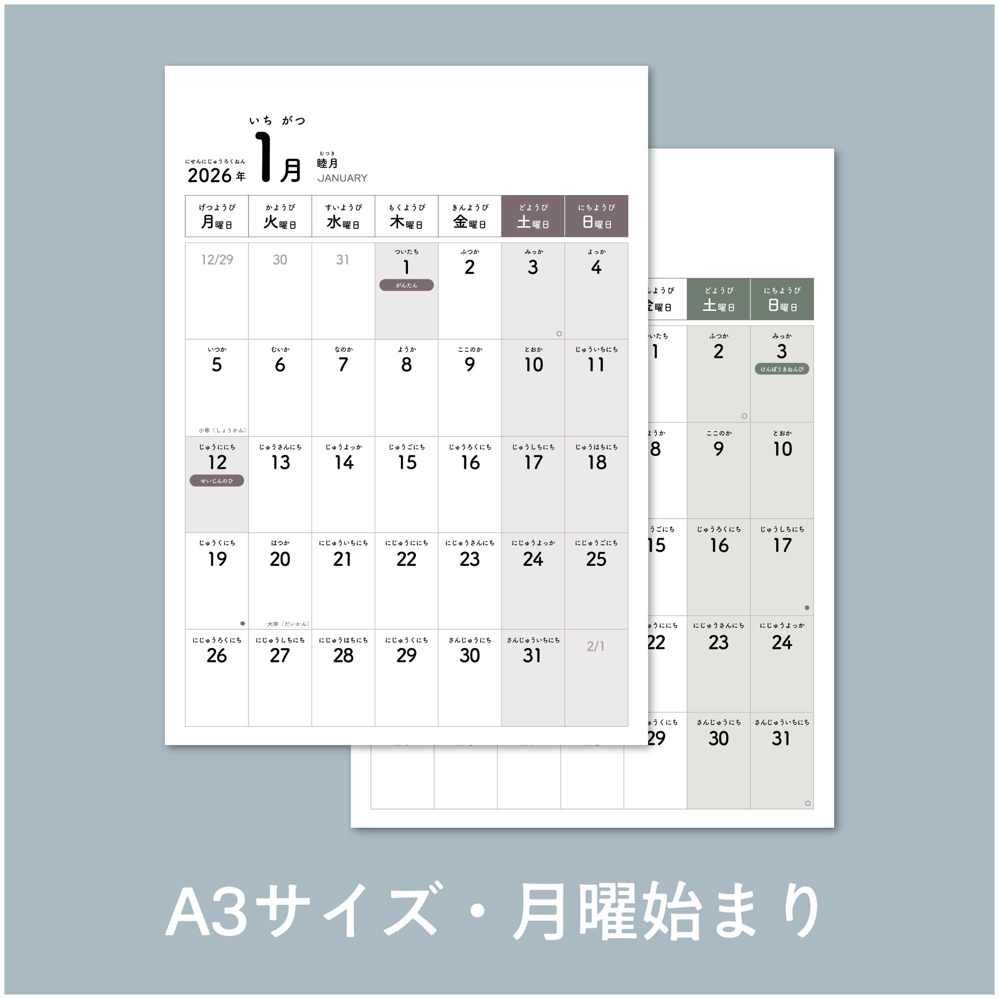 ・A3サイズカレンダー(2026年1月〜12月)